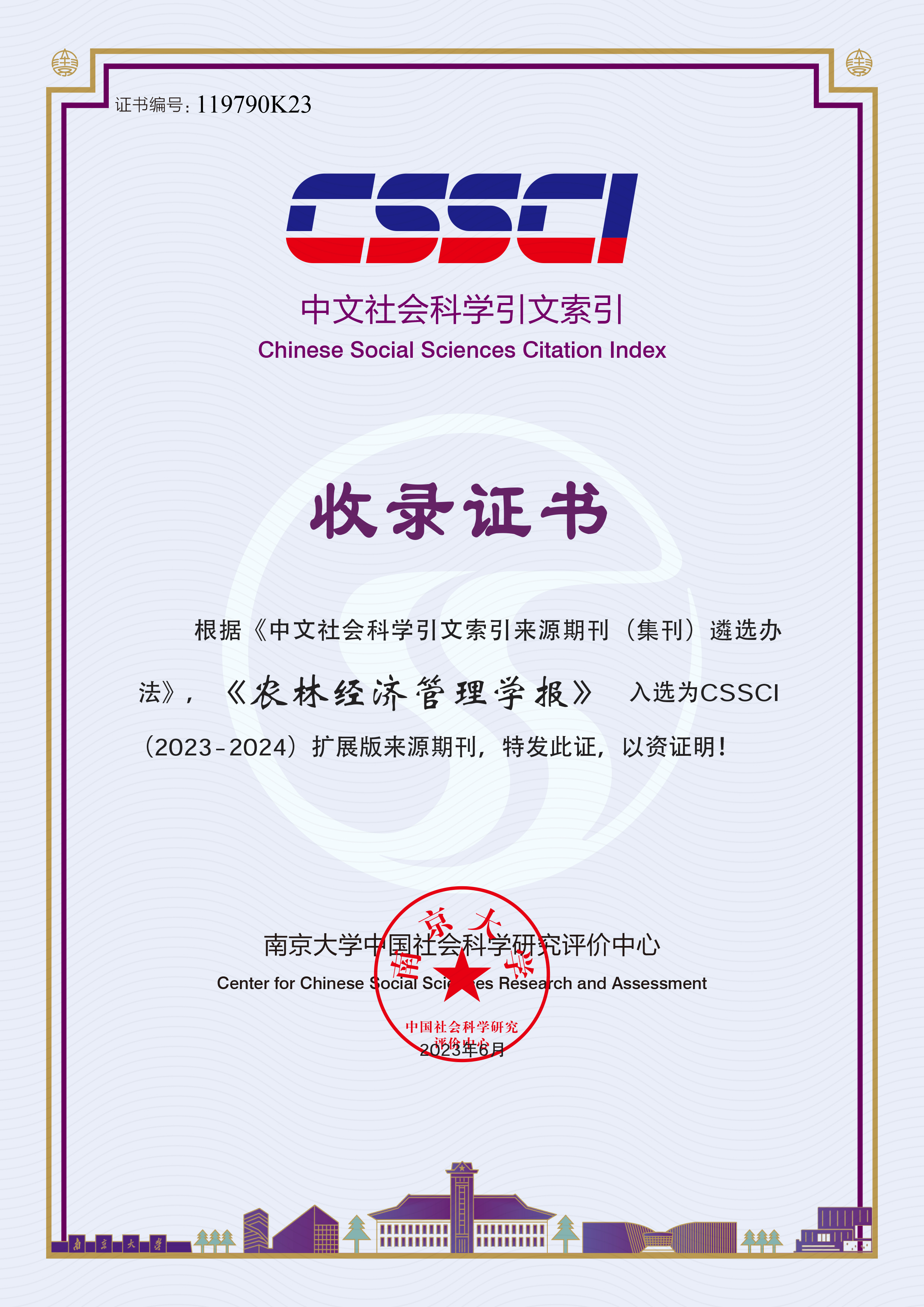 日前,经南京大学中国社会科学研究评价中心(CSSCI)认证并颁发证书,《农林经济管理学报》入选CSSCI(2023—2024)扩展版来源期刊,这也是自2019年来连续3次入选CSSCI扩展版来源期刊。在此,《农林经济管理学报》编辑部衷心感谢各级领导、编委、审稿作者、作者和读者的支持和厚爱。编辑部将继续秉持精品办刊的原则,致力于促进农林经济管理学科发展,为全面推进乡村振兴和农业强国建设贡献智慧和力量。