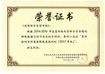 我校《农林经济管理学报》和《管理世界》《中国农业大学学报(社会科学版)》《南京农业大学学报(社会科学版)》《华中农业大学学报(社会科学版)》《华南农业大学学报(社会科学版)》《中国农村观察》《中国农村经济》等期刊一并成为其14家农林经济管理学科的重要转载来源期刊,也是高等院校主办的142种入选期刊之一。(期刊社)